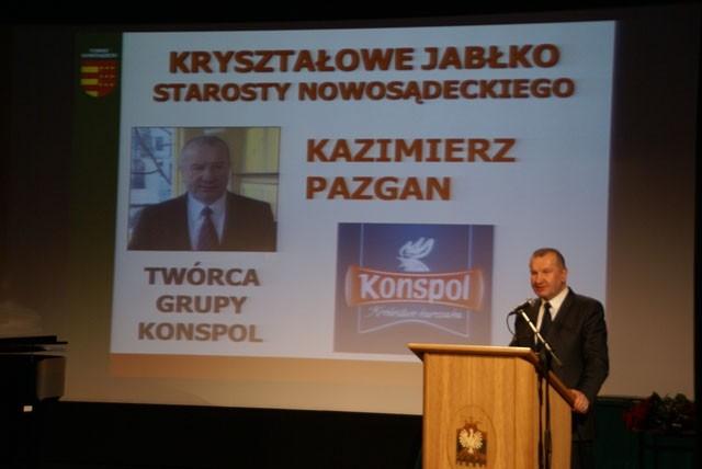 Starostwo Powiatowe w Nowym Sączu i Powiatowy Urząd Pracy dla Powiatu Nowosądeckiego nagrodziły najlepsze firmy naszego regionu podczas dorocznej Gali Przedsiębiorczości „Sądecki Lider Biznesu". Podczas uroczystości, która odbyła się w starosądeckim Sokole, starosta nowosądecki Jan Golonka wręczył Kryształowe Jabłko Sądeckie Kazimierzowi Pazganowi - założycielowi i prezesowi Grupy KONSPOL.